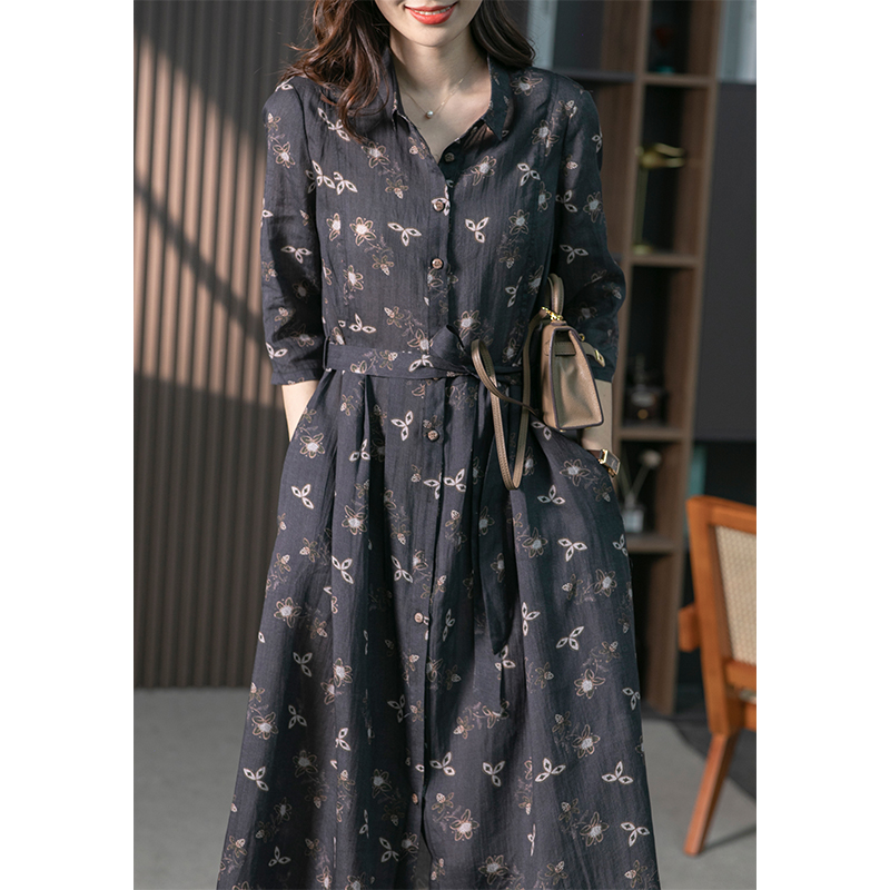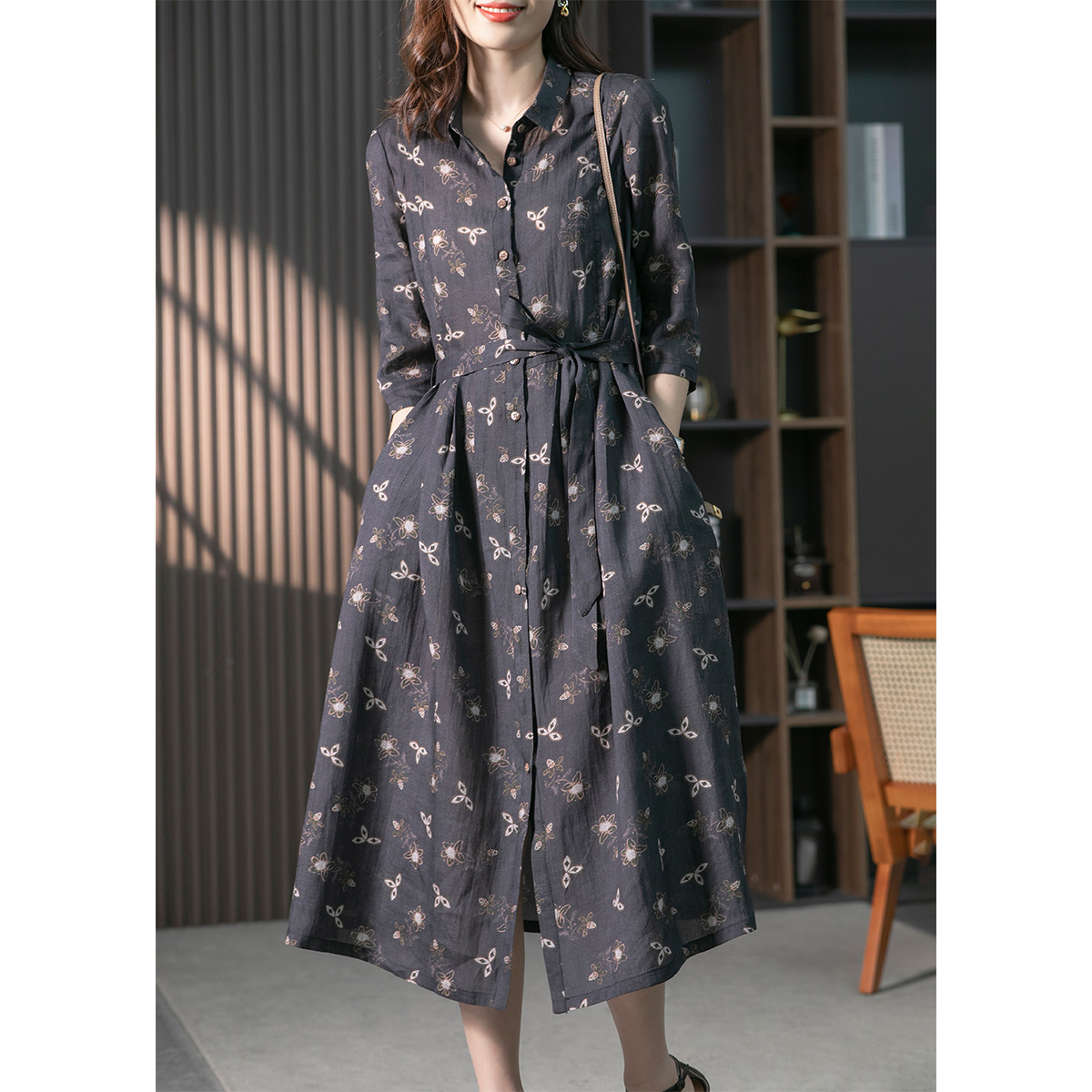 U Family French floral shirtdress Women's mid-length spring/summer 2022 new fashion high sense ramie long skirt