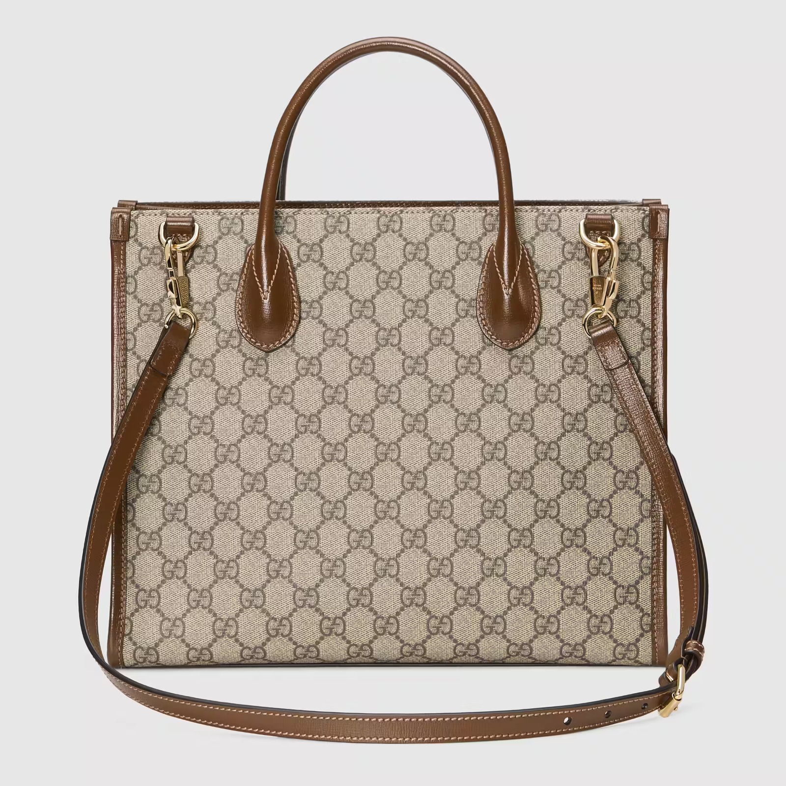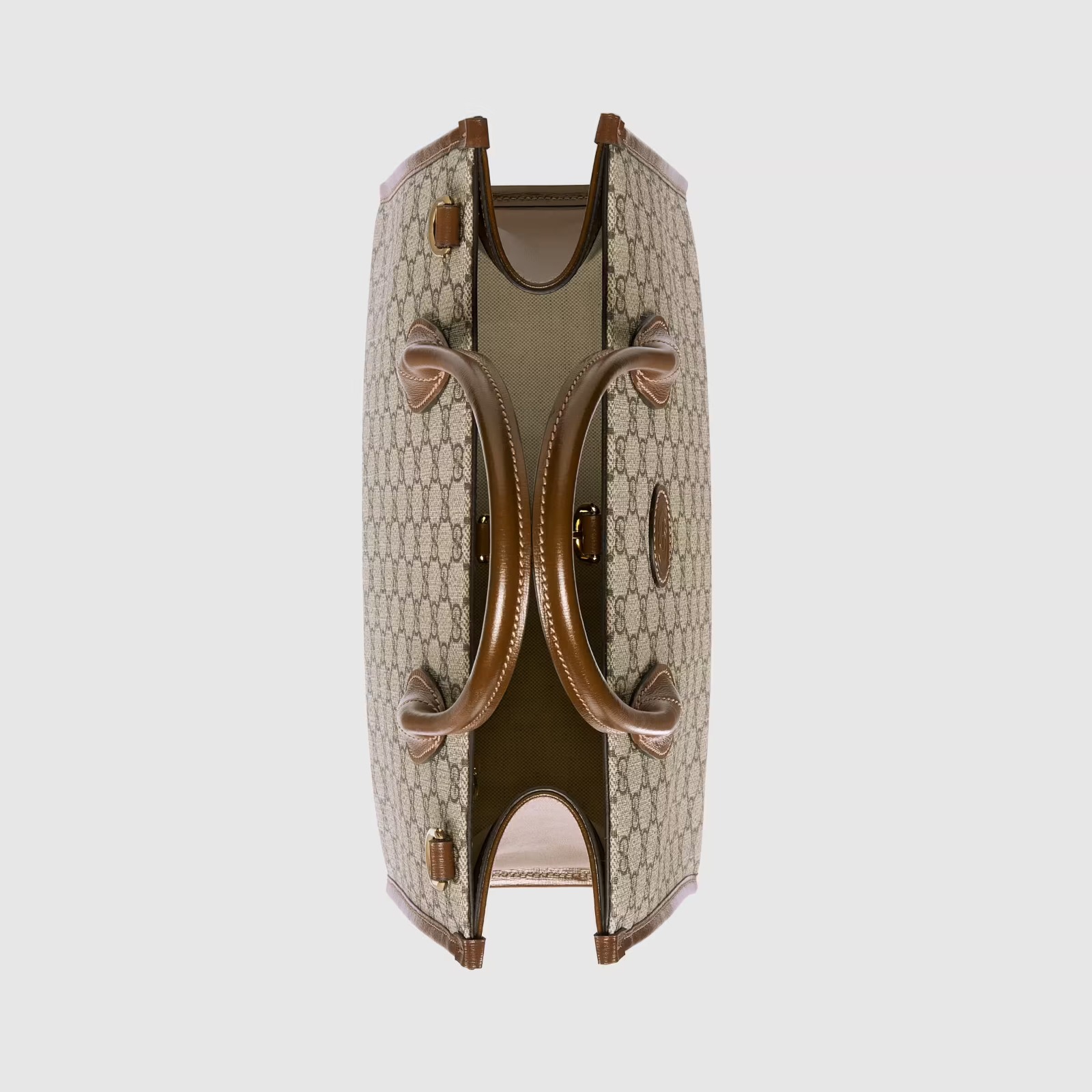 This small handbag uses a stand-up design and is made of GG Supreme canvas with brown leather straps and arm and shoulder straps.