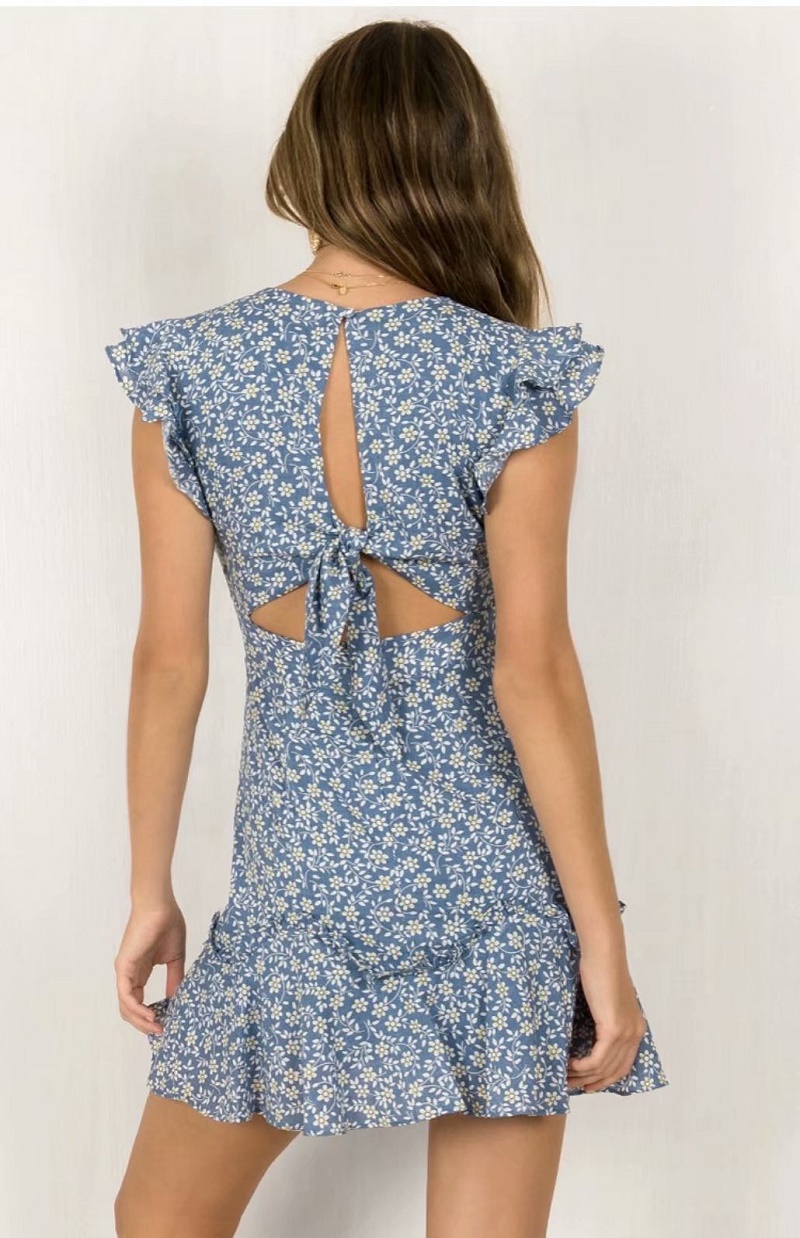 2019 European and American summer idyllic sweet slim slim deep V neck sleeveless backless bow floral dress
