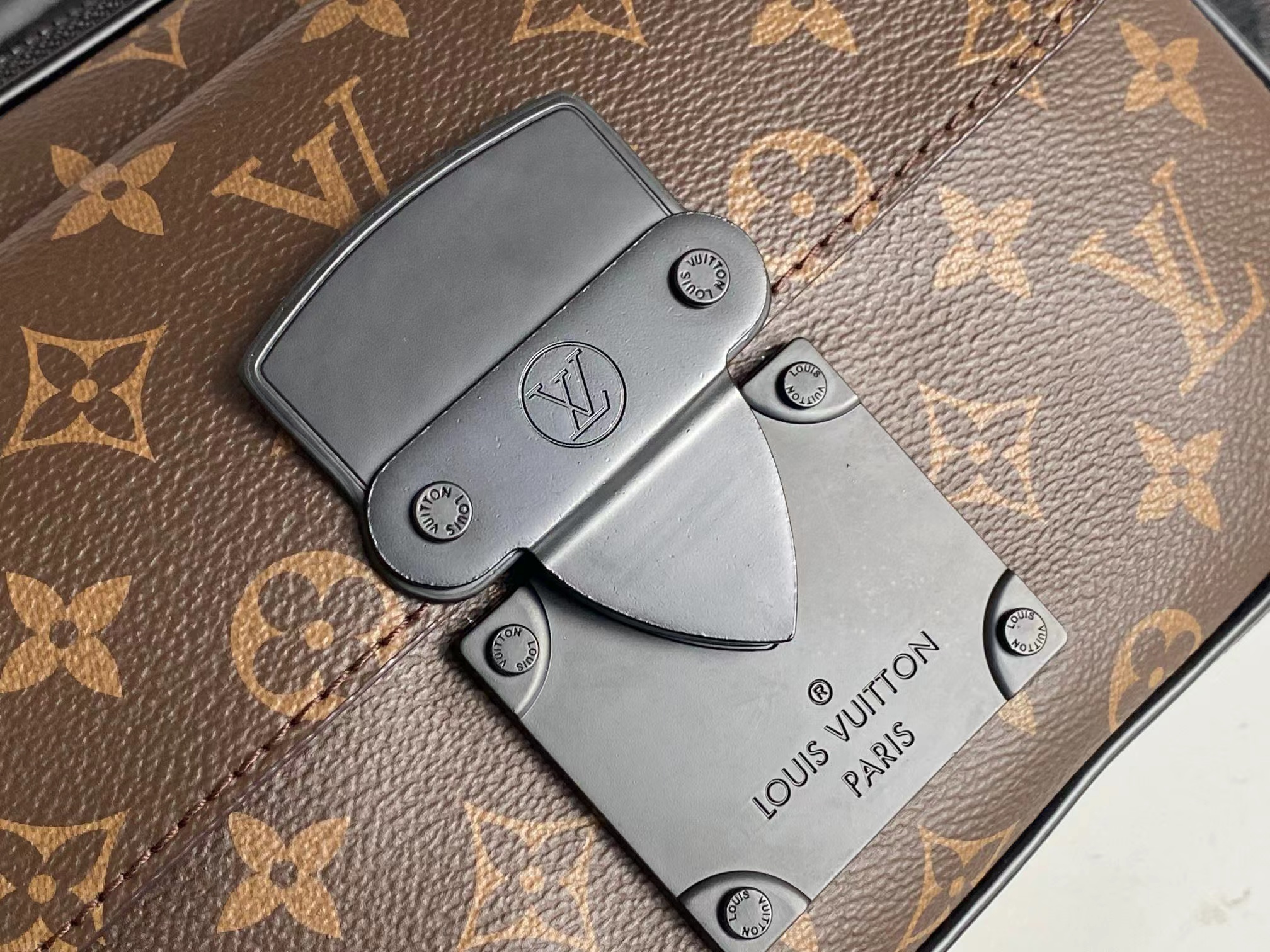 The s Lock bag is made of Monogram Macassar canvas with a new lock inspired by georges Vuitton's 1886 hardcase lock. Special finishing technology gives eye-catching modern color to magnetic metal lock. With ample space zipper compartment, hard box style leather handle and LV logo strap, stylish and easy to use. Size: 22 x 18 x 8 cm